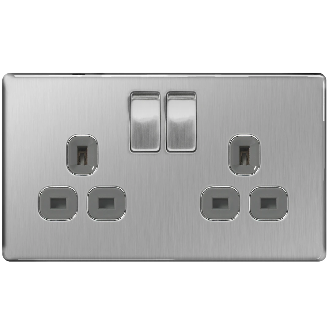 Socket Switched 2 Gang Double Pole 13A Stainless Steel Brushed Grey Insert