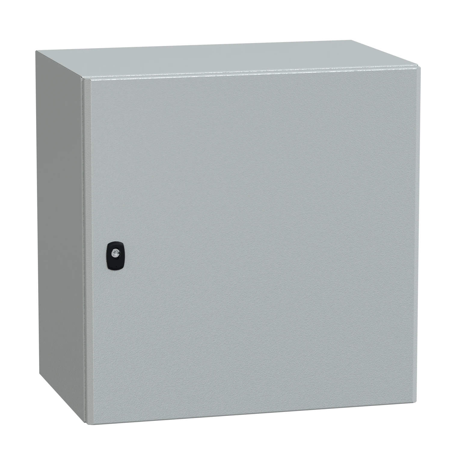 Spacial S3D wall mounted steel enclosure with plain door. 599 x 600 x 250 mm. Single piece body, mounting plate included. 3-point closure system with handle and 3 mm double bar lock insert. Steel made, epoxy-polyester powder finish. Protection IP 66, IK10, Grey RAL 7035. · · · Spacial S3D wall mounted steel enclosure with plain door. · · 599 x 600 x 250 mm. · · Single piece body, mounting plate included. · · 3-point closure system with handle and 3 mm double bar lock insert. · · Steel made, epoxy-polyester powder finish. · · Protection IP 66, IK10, Grey RAL 7035.