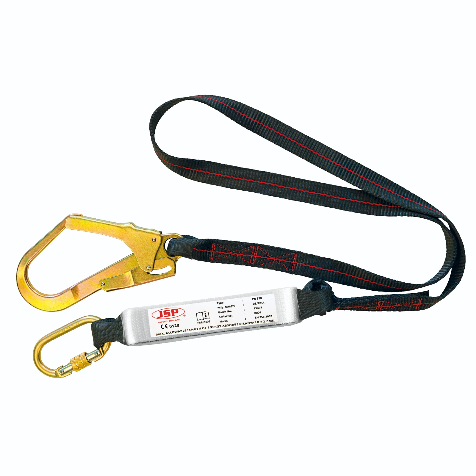 Fall Arrest Kit · · · Webbing lanyard incorporated with shock absorber · · 30 mm wide Polyester webbing · · Length: 2m. · · Fall indicator on the energy absorber · · Comes with 1 screw gate connector in alloy steel & 1 alloy steel scaffold hook · · Conforms to EN355:2002
