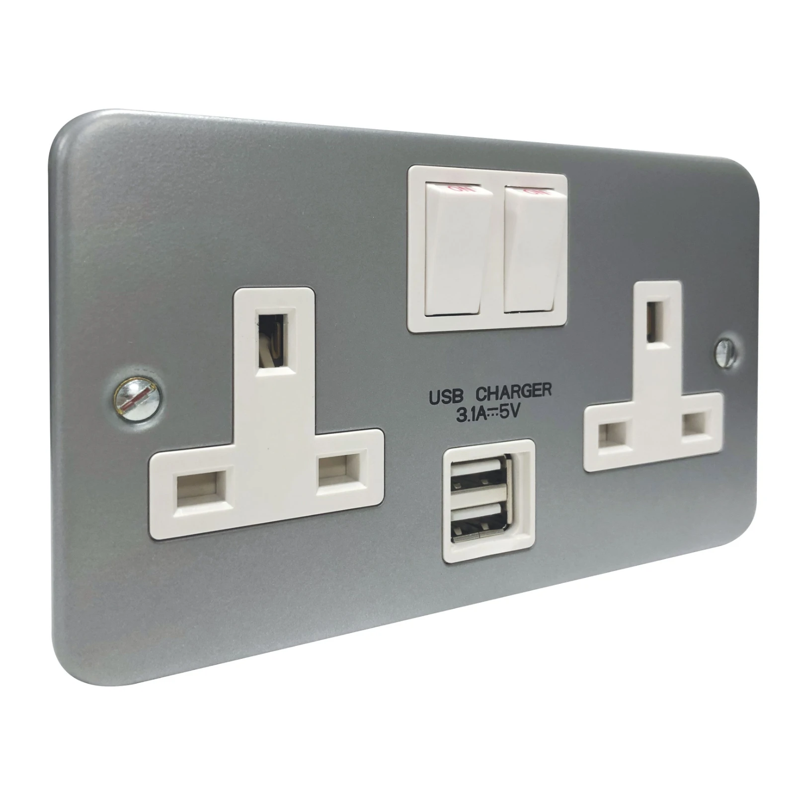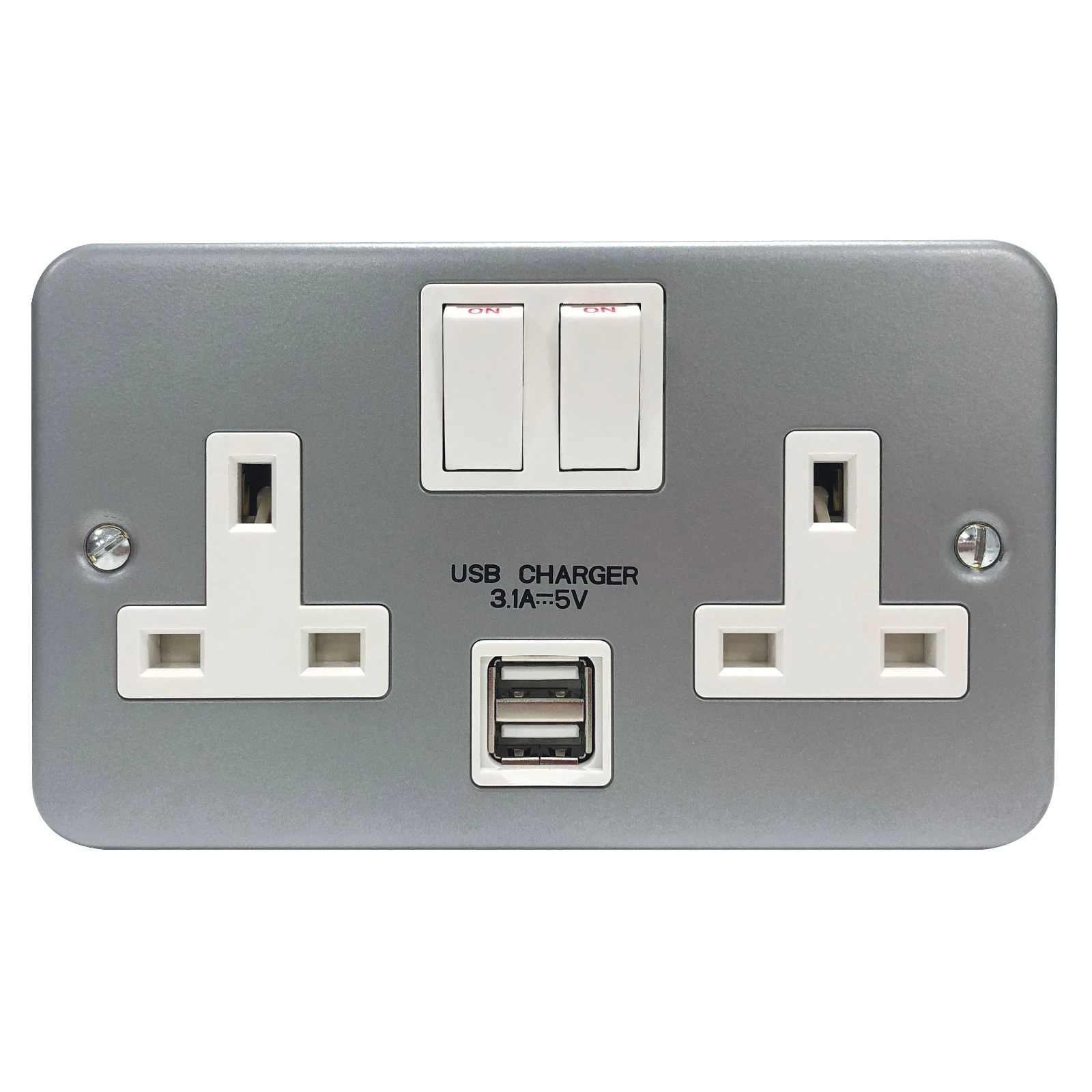 2 x USB sockets – 3.1A total output, 5V. Charges iPad, iPhone, tablets, mobiles, cameras and more – ideal for retrofit. Features a 3.1A USB socket across both ports for faster charging. · · · Tough and impact resistant grey metal clad wiring accesory c/w with surface back box · · Tested and certified by ASTA:BEAB, Intertek and HKSTC · · 20mm knockout top, bottom and sides · · Designed to fit UK standard 2 Gang accessory boxes · · Supplied with M3.5x25mm fixing screws · · Colour codes terminals and backed out and captivated screws for fast installation · · Itegrated dual USB charging capability, Charge time is dependent on the attached device(s) power requirements, and charge time may slow if both ports are used · · Positive feel switches with engraved ON indicator · · Clearly marked terminals for ease of identification · · Double pole switch to isolate appliances safely