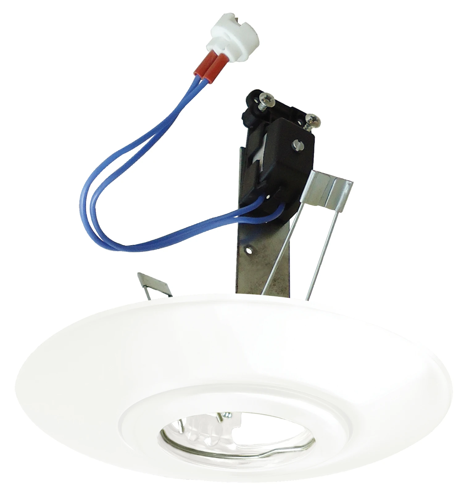 White – Mains / low voltage ceiling downlight converter – Converts traditional mains R50, R64 and R80 downlight and eyeball dimensions to modern GU10 or low voltage lighting · · · mains, low voltage, downlight, converter, GU10, GU5.3 · · Supplied with ceramic GU10 & GU5.3 lampholders · · Converts traditional mains R50, R64 and R80 downlight and eyeball dimensions to modern GU10 or LV lighting: Allows use of modern light source without expensive repairs & decoration · · Hole cut out 70-140mm: Replaces a wide range of outdated downlights · · Shallow profile: Neat, unobtrusive solution · · Fitting is rated at 50W max