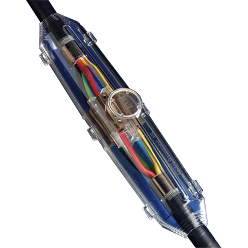 Suitable for use with both armoured and unarmoured cables up to and including 1kv. Injection moulded cable joint shells are rigid and very strong, providing an excellent seal and preventing leakage of resin. Kit contains: Clear shell, crimp connectors, earth braid, constant force springs, core separators, two part resin, sealing tape and gloves · · · Cable Diameter (mm): 8-30 · · Shell Length (mm): 250 · · Shell Diameter (mm): 45 · · Mechanical connectors: Machined brass connectors suitable for low voltage cables with copper or aluminium conductors · · Earth braid: Continuity system providing good electrical contact and is insulated for extra protection · · Constant force springs: React to cable joint movement to maintain a good electrical contact · · Core separators: Provide safe separation of cable cores and mechanical connectors · · Two part resin: Provides excellent adhesion to PVC, XLPE, Polythene and paper cables