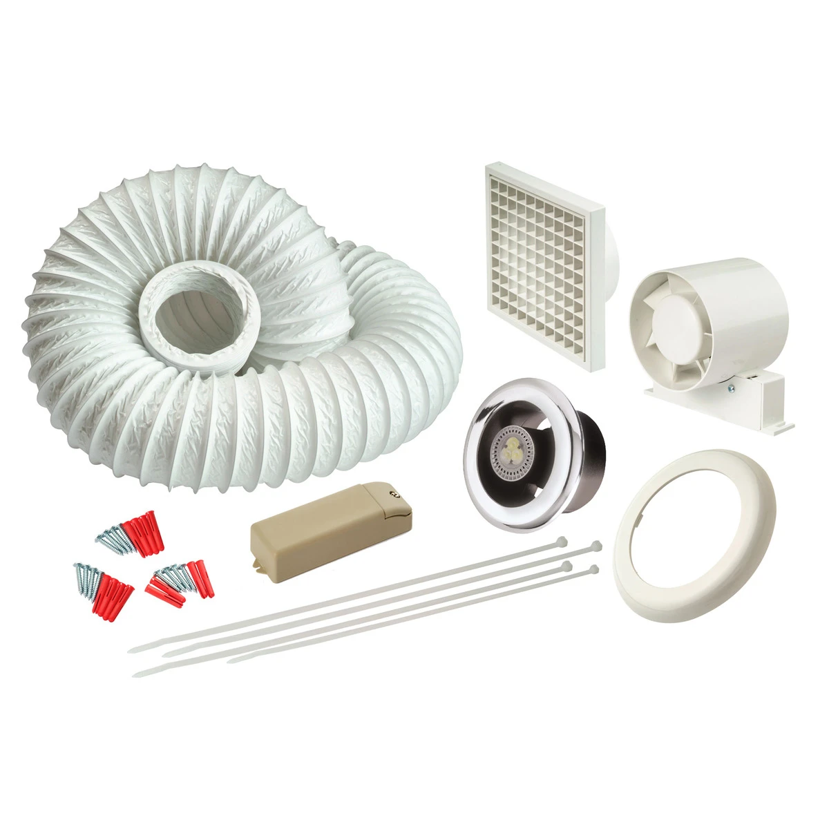 A shower light that incorporates into a circular diffuser and is powered by a SELV LED driver. It offers Part F and L compliant with a specific fan power down to 0.43W/l/s. Pack contains a fan, showerlight unit LED driver, 1 x length PVC flexible ducting, external wall grille, fixing screws plugs, straps and a chrome finished bezel. · · · High extract rate · · IP44 rated · · Built-in timer with delay of 0-30 minutes · · Easy to install and maintain · · Low noise level for quiet operation, enhancing user comfort. · · Sleek and modern design to complement various bathroom aesthetics.