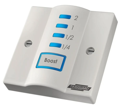 Timeguard STBT4 Timer Electronic Boost 2 Hour · · · 13A (3kW) loading · · Easy to use push button control · · Power status LED indicator illuminates boost button · · ON time can be increased in 4 steps: 0.25, 0.50, 1 and 2 hours · · Fits standard flush or surface mount boxes min 25mm deep · · Switch rating : 13A (3kW) resistive · · Max load: 1000w Filament 500w flourescent 100w CFL 80w LED · · Operating temp 0°C to +45°C · · Boost Times : ¼ hour ½ hour 1 and 2 hours