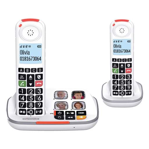 Two easy to use cordless phones with call block facility | Ready for Digital changeover | Answerphone included | Easy dialling thanks to the large keypad | Call blocking function with 100 blacklist | Extra loud ringer (up to 90dB) with big ringing LED indicators | Audio boost for extra loud earpiece volume (+40dB) | 30 min answering machine with slow play messages for clarity | Hearing aid compatible
