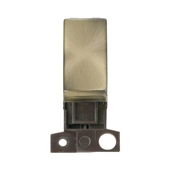 Scolmore MiniGrid Switch Module with antique brass finish. This MiniGrid module is easily and quickly exchanged or mounted onto unfurnished plates by means of a simple single screw fixing. · · · Load Rating 10AX (Suitable For Inductive Loads) · · Terminal Torque 0.4Nm · · Terminal Capacity 4 x 1.5mm2 or 2 x 2.5mm2 · · Back Box Depth Dependent On Plate Used · · Standards BS EN 60669-1:1999 +A1:2002 +A2:2008 · · Warranty 10 Years
