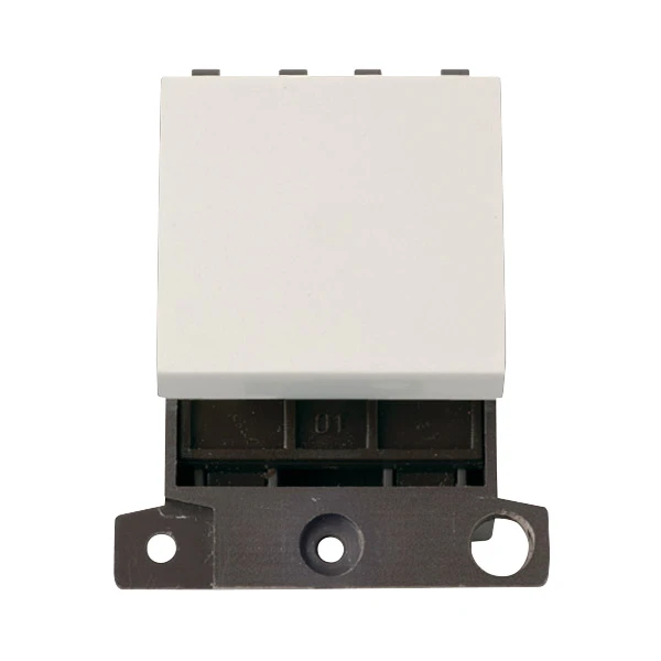 Scolmore MiniGrid Switch Module with polar white finish. This MiniGrid module is easily and quickly exchanged or mounted onto unfurnished plates by means of a simple single screw fixing. · · · Polar white finish · · 20A current rating · · BS EN 60669-1 standards