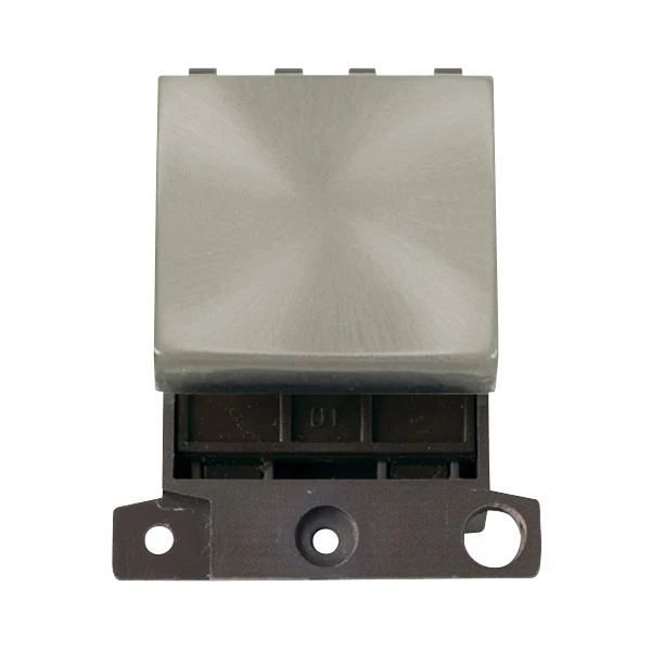 Scolmore MiniGrid Switch Module with satin chrome finish. This MiniGrid module is easily and quickly exchanged or mounted onto unfurnished plates by means of a simple single screw fixing. · · · Satin chrome finish · · 20A current rating · · BS EN 60669-1 standards