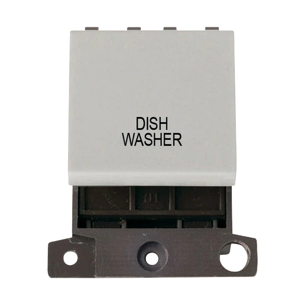 Scolmore MiniGrid Switch Module with Click white finish and Dishwasher marking. This MiniGrid module is easily and quickly exchanged or mounted onto unfurnished plates by means of a simple single screw fixing. · · · White finish · · 20A DP · · BS EN 60669-1