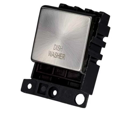 Scolmore MiniGrid Switch Module Satin Chrome finish and Dishwasher marking. This MiniGrid module is easily and quickly exchanged or mounted onto unfurnished plates by means of a simple single screw fixing. · · · Satin Chrome finish · · 20A DP · · BS EN 60669-1