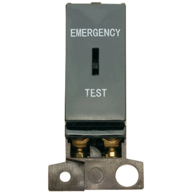 Scolmore MiniGrid Keyswitch Emergency Test Module with Click black finish. The MiniGrid module illustrated is all easily and quickly exchanged or mounted onto unfurnished plates by means of a simple single screw fixing. · · · Black finish · · 10A current rating · · BS EN 60669-1 standards