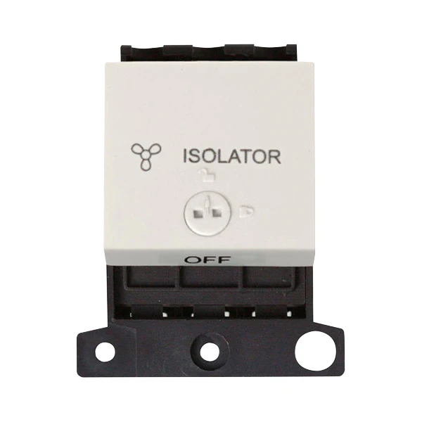 Scolmore MiniGrid Lockable Fan Switch Module with polar white finish. This MiniGrid module is easily and quickly exchanged or mounted onto unfurnished plates by means of a simple single screw fixing. · · · Load Rating 10A · · No. of poles 3 · · Product Markings On, Off Fan Isolator + Lock · · Maximum Voltage 250V · · Back Box Depth Dependent On Plate Used · · Dimensions 41mm (W) x 52.5mm (H) x 22mm (D) · · Aperture Dimensions 32mm (W) x 31.5mm (H) · · Operational Temperature -5C to +40C