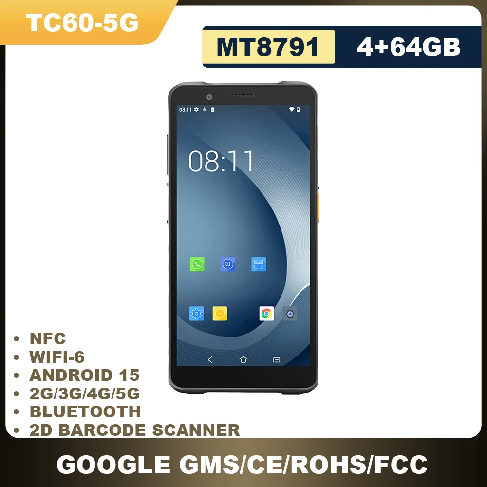 Product Features I. Display and Operation Experience * Large Screen with High Screen-to-Body Ratio: Equipped with a 6-inch display and featuring a narrow bezel design, the screen-to-body ratio is improved compared to the previous generation, providing a wide field of view. It supports comfortable one-handed holding, balancing display size and portability. * Sensitive Touch Control: Equipped with an ultra-sensitive capacitive touchscreen that supports multi-touch. It can be operated with gloves or wet hands, adapting to complex industrial scenarios. II. High-Speed Network and Performance * Next-Generation Network Support: Supports 5G WWAN and Wi-Fi 6E. Wi-Fi 6E adds a 6GHz frequency band, increasing capacity by 2.5 times and reducing latency by 8 times compared to the previous generation. It also supports 2×2 MU-MIMO technology for seamless roaming and fast, stable data transmission. * Powerful Core Configuration: Equipped with a 2.0GHz octa-core high-performance processor, paired with 4GB+64GB basic memory (8GB+128GB optional), and supports a maximum of 256GB Micro-SD expansion. It runs on the Android 15 system, has passed GMS certifications, ensuring smooth operation and reliable quality to meet the needs of seamless multi-task execution. III. Efficient Data Collection Function * Millisecond-Level Barcode Scanning Capability: Built-in professional scanning engine Newland CM60 that can quickly decode 1D/2D barcodes and QR codes, including distorted, damaged, screen-displayed, and laminated special barcodes, significantly improving work efficiency. * ** Dual NFC Scanning Modes**: Supports rear NFC and in-screen NFC, enabling functions such as secure identity verification, patrol check-in, electronic access control, and member identification, expanding scenario applicability. IV. Battery Life and Management * Long Battery Life and Flexible Power Supply: Equipped with a 5000mAh removable battery and supports hot-swap technology (no need to shut down when replacing the battery), enabling 12 hours of continuous operation and 14 days of standby. It also supports 18W fast charging, which can fully charge the battery in 3 hours. * AI-Intelligent Battery Management: Equipped with an AI-driven intelligent charging solution, featuring battery aging protection, long-term charging protection, and battery health display. The default “Intelligent Mode” can automatically switch to “Extended Battery Life Mode” or “Ultra-Long Battery Life Mode”. Additionally, the “Long-Life Mode” can control the battery capacity at 80% to reduce cycle loss. V. Durability and Industrial-Grade Quality * Rigorous Environmental Protection: Achieves IP68 dust and water resistance rating and can withstand a 1.5-meter drop. It has passed 12,000 micro-drop tests, 3 million scan key tests, 400 1-meter roll tests, and 10,000 USB port plug-in tests, adapting to harsh industrial environments. * Wide Temperature Range and Anti-Interference: Operates in a temperature range of -20~+60℃ and can be stored at -40~+70℃. It supports a humidity environment of 5%RH~95%RH without condensation and has ESD protection capability of ±15kV air discharge and ±8kV contact discharge. VI. Audio and Communication * Clear Instant Communication: Equipped with a 1.5W high-performance speaker and supports PTT intercom function. Combined with dual-microphone noise reduction and earpiece echo cancellation technology, it ensures clear sound even in noisy environments, enabling group calls, voice messages, and one-on-one calls/video calls. * Full-Frequency Communication and Positioning: Supports 5G/4G/3G/2G cellular networks and Bluetooth 5.2 (including BR/EDR/BLE).In terms of positioning, it is compatible with four major satellite systems: GPS, Beidou, GLONASS, and Galileo, ensuring accurate positioning. VII. Scenario Adaptation * Multi-Scenario Application: Covers retail (front-end replenishment, price management, inventory counting), on-site service (parts inventory, route optimization, asset management), ticket verification (aviation/scenic spot/event ticket management), and logistics and transportation (delivery confirmation, route calculation, employee identity verification) and other fields. Recommended by seller TC60-Lite MT6762 Octa-core 2.0GHz 4+64GB 5.99 Inch Rugged Android 12 GMS 2D Barcode Scanner IP67 4G WIFI for 5.2 NFC CE.