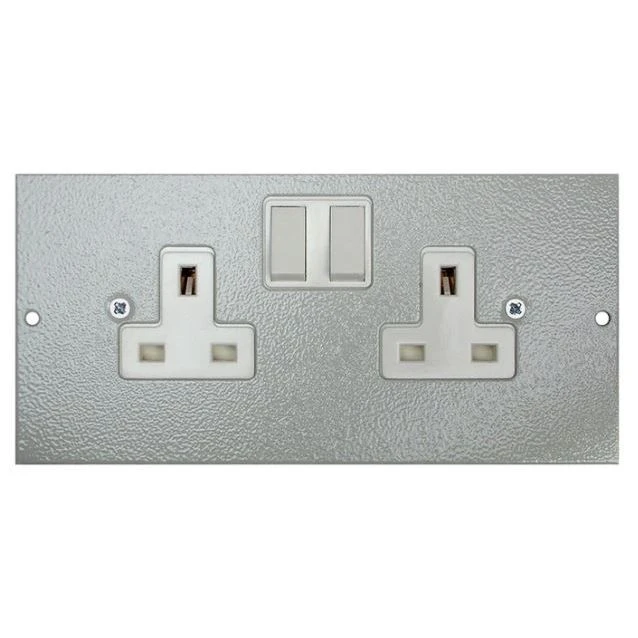 Twin Switched Sockets Plate for use with floorboxes · · · Twin switched 13A socket plate · · Made from galvanised steel · · Leatherette texture power coated galvanised steel · · RAL 7035 · · 185mm x 89mm