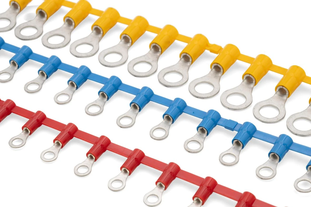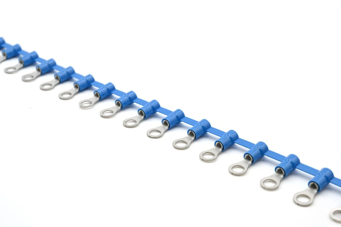 1.5mm²-2.5mm² Halogen free Polycarbonate insulated chain linked ring terminals M4 stud blue · · · Insulation sleeve in Polycarbonate · · -20°C to 115°C Temperature Range · · Halogen Free · · Annealed to guarantee optimum ductility · · Electrolytically tin-plated to avoid oxidisation · · Facilited Introduction of the conductor