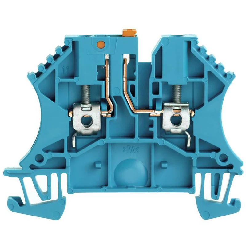 Weidmuller 8731640000 blue TS 35 snap-on mounting modular test-disconnect terminal made of Wemid body. The WTR 2.5 BL terminal features M2.5 clamping screw, 26 to 12AWG wire connection cross section, 0.4 to 0.8Nm tightening torque, 6kV rated impulse withstand voltage and 24A rated current. · · · Colour: Blue · · Conductor Size: 26-12 AWG · · Height: 60mm · · Material: Wemid · · Width: 5.1mm · · Weight: 8g · · Depth: 48mm