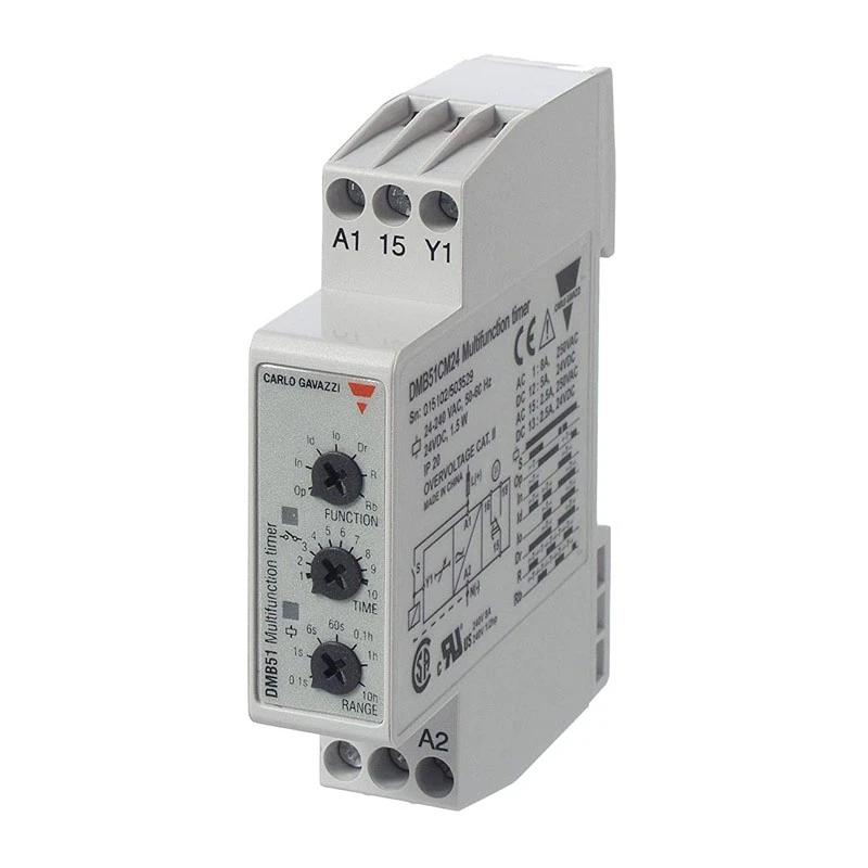 Carlo Gavazzi DMB51 Multifunction Timer with 7 knob-selectable functions and 7 knob-selectable time ranges within 0.1s and 100 hours. It is suitable for mounting on DIN rail. Housing 17.5mm wide for SPDT version and 35.5mm for DPDT version, suitable both for back and front panel mounting. The time period begins as soon as the trigger contact is closed. At the end of the set delay time the relay operates and does not release until the trigger contact is closed again or the power supply is disconnected. If the trigger contact is closed before the end of the delay time, the device resets and a new time period starts. The relay operates and the time period begins as soon as the trigger contact is closed. The relay releases at the end of this period or when the power supply is disconnected. The relay operates again when the trigger contact is closed again. If the trigger contact is closed before the end of the delay time, the device resets and a new time period starts. · · · Time range 0.1 s to 100h · · 4 knob selectable functions · · Aa – Asymmetrical recycler ON first · · Ab – Asymmetrical recycler OFF first · · Sh – One shot time function · · Dt – Two state delay on operate (2 relays versions only) · · Selection of time range by DIP switches · · Knob adjustable time setting Automatic start · · Output: 1 or 2 x SPDT relay · · 17.5mm DIN Rail Housing