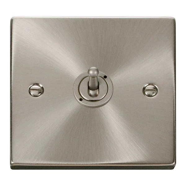 Scolmore Deco Toggle Switch with antique satin chrome finish stainless steel front plate. This smooth modern lines of the Deco plate switch will fit easily into traditional and contemporary designs alike. It is developed largely as a modular range. · · · Satin chrome finish · · 10A current rating · · BS EN 60669 standards