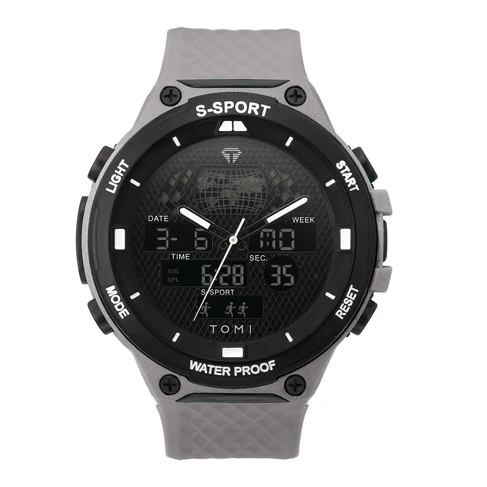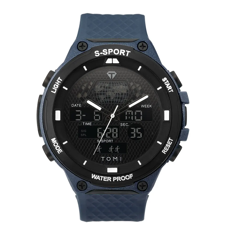 TOMI Sport Digital Watch LED Dual Display Simple Multi-function Stop Watch Feature 50mm Dial Diameter Leather Band Hangzhou