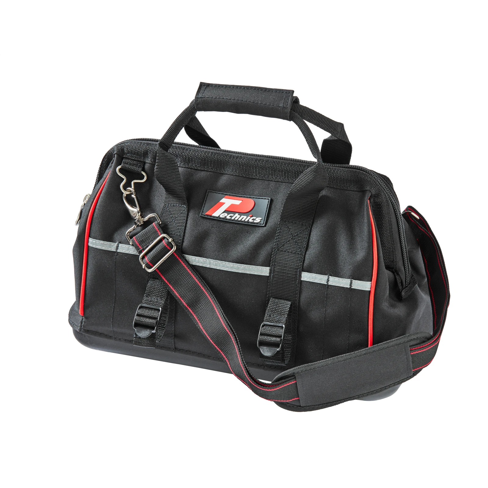 TECHNICS 16″ HARDBOTTOM TOOLBAG BLACK – PQ4 · · · Made from reinforced material: 600 x 600 denier to minimise wear and tear. · · The bag is double stitched and glued to the base for longer life. · · Water resistant PVC base. · · Variety of inner and outer pockets to secure tools · · Outer straps secure bulky tools. · Heavy duty zips. · · Double stitched and glued to the base for longer life