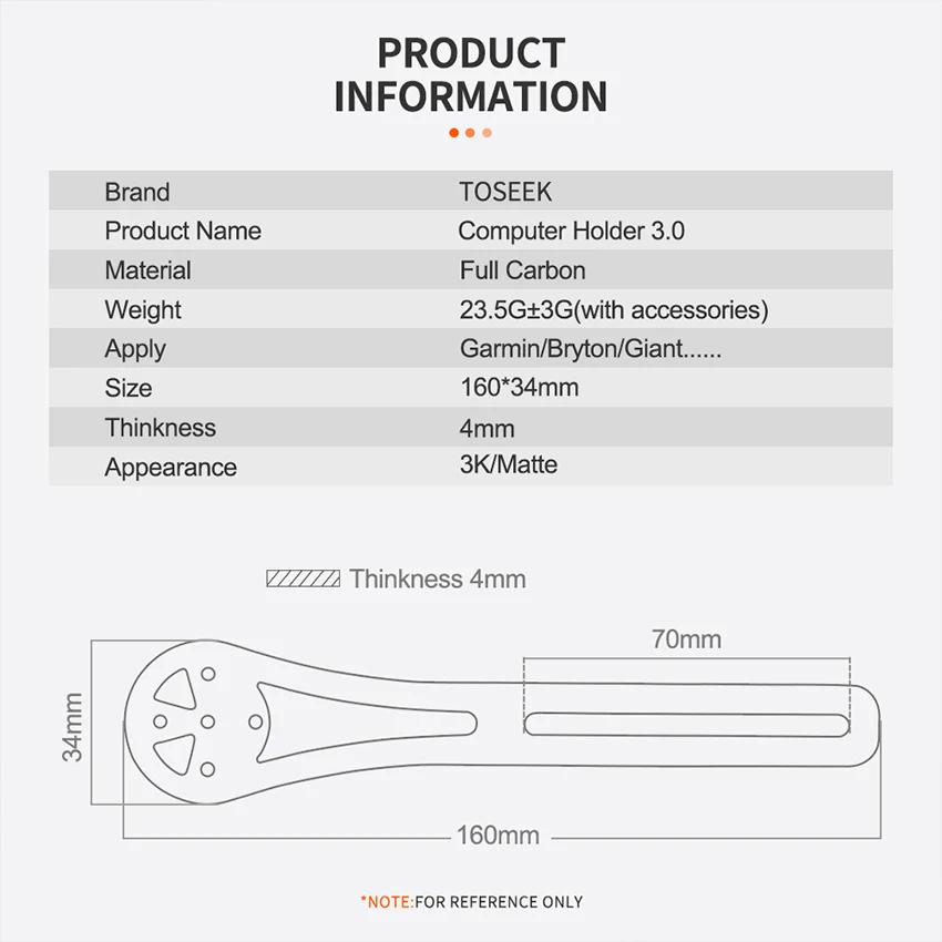 : For GARMIN: Supports GARMIN EDGE Series Bike Computers (Edge20 25 200 500 510 520 800 810 820 1000 1030), and iGPSPORT Series Bike Computers (iGS10 20 20plus 50E 60 618) For BRYTON: Supports Bryton Rider Series Bike Computers (Rider10 310 330 530 410 ) For CATEYE: Supports CATEYE’s full line of bicycle computers. Trigo: Cameras that support the Gopro camera holder and the same interface. Light Holder: Supports bicycle lights that do not exceed 25mm in diameter. Features: Easily attach it to the handlebar to record your riding experience in a new way. Compatible for Gopro, very good bike accessories. Reducing wind drag, improve visual field, ensure safety. Bike Stopwatch Holder only, other accessories demo in the picture is not included! Specification: Material: Full Carbon Weight: 23G+3G(with accessories) Size: 160*34mm Thinkness: 4mm Color: Black Appearance: 3K Gloss Note: 1.Please allow 1-3cm error due to manual measurement. pls make sure you do not mind before you bid. 2.Due to the difference between different monitors, the picture may not reflect the actual color of the item. Thank you!