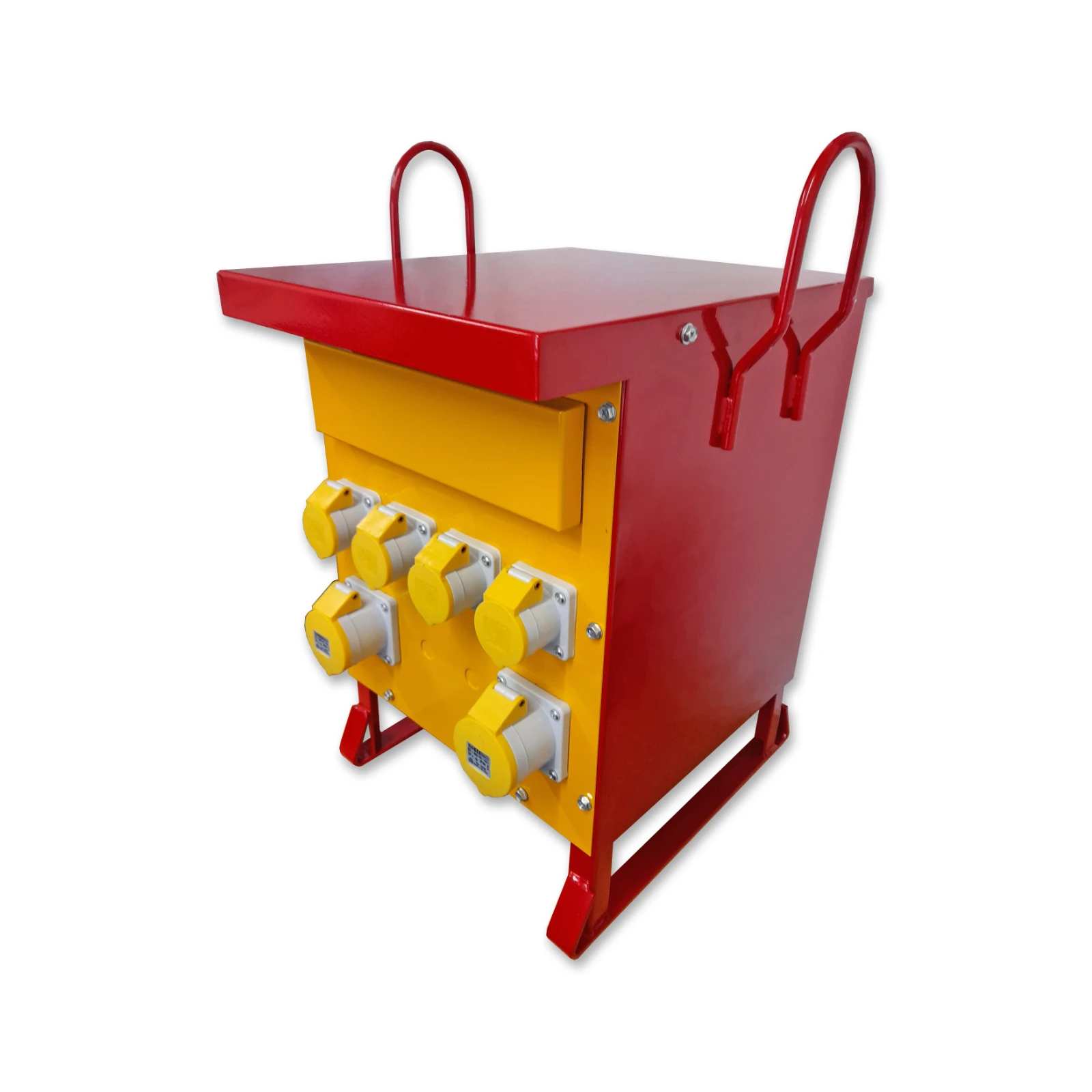 Material: Metal|Finish: Mild Steel|Colour: Red / Yellow|Length (mm): 464|Width (mm): 650|Height (mm): 465|Weight (kg): 70 · · · 2x32A & 4x16A 110V 3P socket outlets IP44 · · IP44 rated · · IP44 rated · · The base is on welded skids keeping the internal coil off the ground and providing airflow for cooling. This can be lifted from underneath with a forklift or above by utilizing the welded side lifting loops. · · Internal terminal connection for the supply via a rear 20mm gland entry · · floor standing · · MCB Cover · · BSEN 60309 socket outlets fitted · · BSEN 60898 circuit protection fitted · · Tri-rated wiring