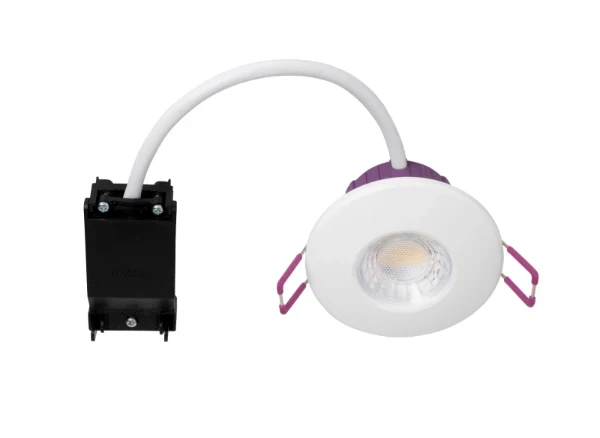 The Robus triumph slim 7w ip65 colour selectable white fire rated downlight is a high-quality, energy-efficient LED downlight that is perfect for a wide range of applications, including kitchens, bathrooms, living rooms, bedrooms, hotels, offices, and other commercial and domestic settings.The triumph slim 7w ip65 colour selectable white fire rated downlight is made from durable polycarbonate and has a shallow profile of only 52mm. It is also IP65 rated, meaning that it is dust-tight and protected against water jets from any direction.The triumph slim 7w ip65 colour selectable white fire rated downlight produces a bright, white light with a color temperature of 3000K or 4000K. You can select your desired color temperature using a switch under the trim. This makes it easy to create the right atmosphere for your needs. · · · Suitable for domestic dining, living, bathroom and bedroom spaces, hotel & office reception areas · · LED replacement for 50W halogen downlights · · Colour temperature selectable; switch under trim allows selection between 3000/4000K · · LEDchroic lens replicating halogen dichroic with uniform, shadow-free light · · Tested for use with I-Joists & Metal Web Joists · · Complies with BS476 Part 21. · · Designed and tested to retain the integrity of 30, 60 and 90 minute fire rated ceilings – compliant with Building Regulations Parts B, C and E · · Designed and tested to be covered with insulation
