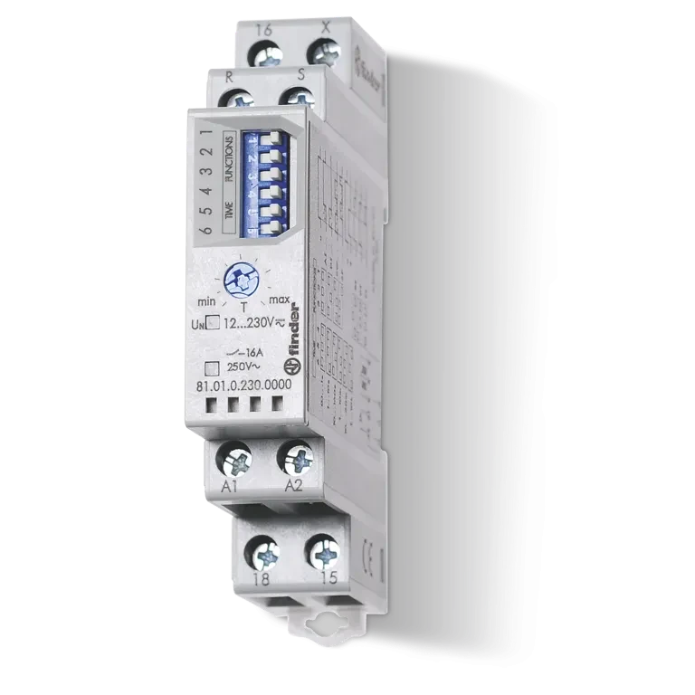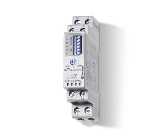 Type 81.01 AC (50/60 Hz)/DC Modular timer, Multi-voltage (non polarized DC), Multi-function, suitable for 35mm rail (EN60715) mount. Functions: • AI: On-Delay • DI: Interval • SW: Symmetrical flasher (start pulse On) • SP: Symmetric flasher (start pulse Off) • BE: Off-delay with control signal • DE: Interval with the control signal on • EEb: Interval with control signal off · · · Six time ranges from 0.1 s to 10 h · · Seven functions (4 with supply start and 3 with signal start with Reset function) · · Nominal voltage (12…230) V AC/DC · · Reset function · · One module 17.5 mm wide housing · · 35 mm rail (EN 60715) mounting · · Break points on fingers and base · · Supplied in 2m lengths · · UL Recognised: UL 1565 | E509564 · · Flame Resistance: V0 UL94
