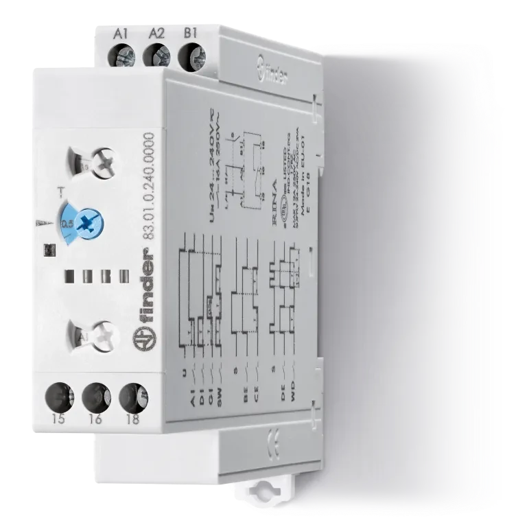 Type 83.01 is a modular timer, 17.5mm wide, multi-voltage, 1 contact. It has the following functions: • AI: On-Delay • DI: Interval • GI: Pulse delayed • SW: Symmetrical flasher (start pulse On) • BE: Off-delay with control signal • CE: On and Off-Delay with control signal • DE: Interval with control signal on • WD: Watchdog · · · Eight time ranges from 0.05 s to 10 days · · Nominal voltage (24…240) V AC/DC · · Special version: 2 timed contacts or 1 timed + 1 instantaneous contact · · External time setting potentiometer option pause function option · · 22.5 mm wide · · 35 mm rail (EN 60715) mount · · “Blade + cross”: Both flat blade and cross-head screwdrivers can be used to adjust the range and function selectors, the timing trimmer, and to disengage the 35 mm rail clip · · Compliant with EN 45545-2: 2013 (protection against fire and fumes) · · Compliant with EN 61373 (resistance to shock and vibration, category 1, class B) · · Compliant WithEN 50155 (resistance to temperature and humidity, class T1)