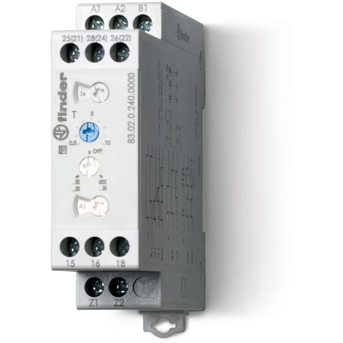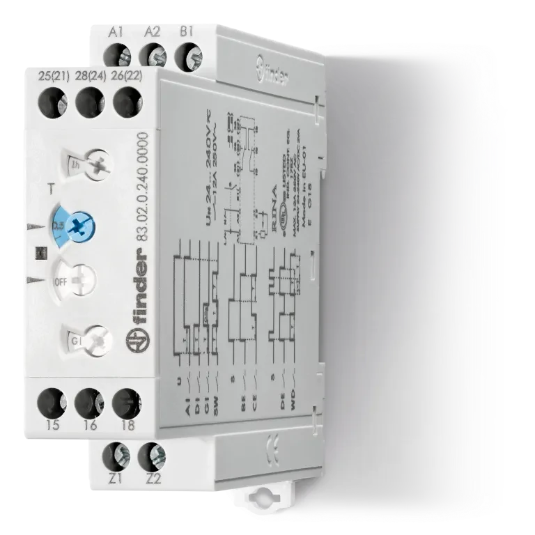 Type 83.02 is a modular timer, 22.5 mm wide, multi-voltage with 2 delayed contacts or 1 delayed contact + 1 instantaneous contact. Equipped with adjustable timing with external potentiometer. It has the following functions: • AI: On-Delay • DI: Interval • GI: Pulse delayed • SW: Symmetrical flasher (start pulse On) • BE: Off-delay with control signal • CE: On and Off-Delay with control signal • DE: Interval with control signal on • WD: Watchdog · · · Multi-function · · Eight time scales from 0.05 s to 10 days · · 2 Pole (timed + instantaneous options), external time setting potentiometer option · · Wide power supply range (24… 240) V AC/DC · · 22.5 mm wide · · 35 mm rail (EN 60715) mount · · “Blade + cross”: Both flat blade and cross-head screwdrivers can be used to adjust the range and function selectors, the timing trimmer, and to disengage the 35 mm rail clip · · Compliant with EN 45545-2: 2013 (protection against fire and fumes) · · Compliant with EN 61373 (resistance to shock and vibration, category 1, class B) · · Compliant WithEN 50155 (resistance to temperature and humidity, class T1)