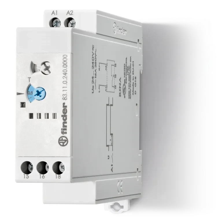 Type 83.11 is a modular timer, 22.5 mm wide, multi-voltage and single function with AI function (on-delay). · · · Mono-function · · Eight time scales from 0.05 s to 10 days · · On Delay · · Wide power supply range (24… 240) V AC/DC · · 22.5 mm wide · · 35 mm rail (EN 60715) mount · · “Blade + cross”: Both flat blade and cross-head screwdrivers can be used to adjust the range and function selectors, the timing trimmer, and to disengage the 35 mm rail clip · · Compliant with EN 45545-2: 2013 (protection against fire and fumes) and · · Compliant with EN 61373 (resistance to shock and vibration, category 1, class B) · · Compliant WithEN 50155 (resistance to temperature and humidity, class T1)