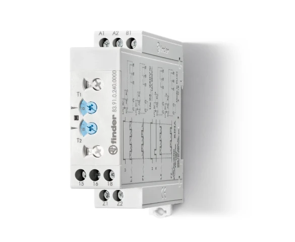 Type 83.91 Multi-function and multi-voltage modular timer. Four Asymmetrical flasher functions. · · · Multi-function · · Timing adjustment: 0.05 s to 10 days · · Four Asymmetrical flasher functions. · · Wide supply range (24…240)V AC/DC · · 22.5 mm wide · · 35 mm rail (EN 60715) mount · · “Blade + cross”: Both flat blade and cross-head screwdrivers can be used to adjust the range and function selectors, the timing trimmer, and to disengage the 35 mm rail clip · · Compliant with EN 45545-2: 2013 (protection against fire and fumes) and · · Compliant with EN 61373 (resistance to shock and vibration, category 1, class B) · · Compliant WithEN 50155 (resistance to temperature and humidity, class T1)