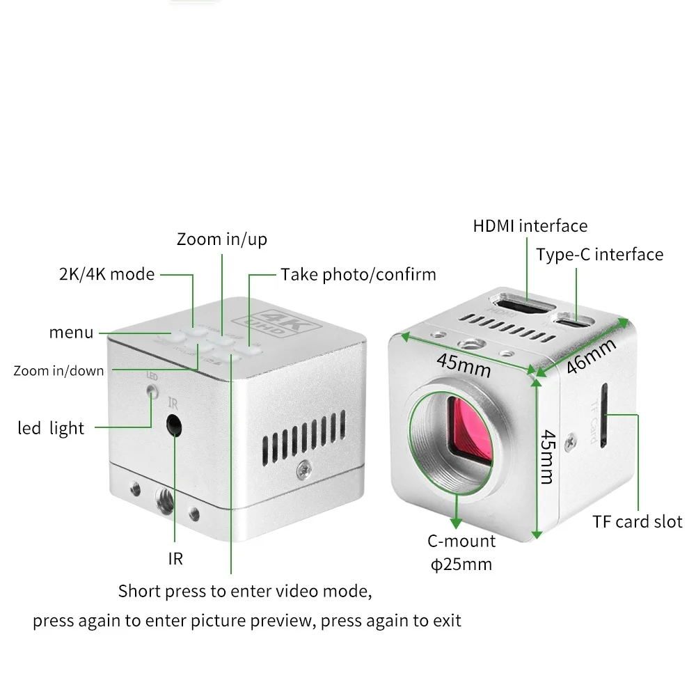 Sensor CMOS IMX 678 Pixel size 2.0μmx2.0μm Function Take a record /video,measurement Interface HDMI & USB Feature: 1.This is UltraHD 4K industrial camera, 2.The resolution is 3840 x 2160 pixels,Adopt standard HDMI interface, 3. It can be used as education, scientific research, laboratory, demonstration, maintenance and inspection 4. Use HDMI splitter to project to a large FHD TV for the best display Camera Specification: Item Type: Microscope Camera Sensor: Sony CMOS IMX678 Sensor Optical Format: 1/1.8inch Pixel Size: 2.0μmx2.0μm Interface: HDMI (Type A). USB (Type B). Small memory card HDMI Image Resolution: 41MP HDMI Video Resolution: 4K:3840x2160P 30FPS 2K:1920x1080P at 60FPS HDMI Scale: Support 4: 3,16: 9 screen USB2.0 (Drive Free): 1920 x 1080 at 60FPS 1280 x 720 at 60FPS Small Memory Card: Up to 128G,256GB (not included) AWB: AWB color correction/automatic/manual R.G.B value setting independent Exposure: Automatic/manual. AE value can be set Cross Line: 8 lines, color, width, position can be set Scale Line: 2 lines. Dotted Line: 2 lines, color, width, position can be set Sharpness Contrast Color Gain: Support Mono Negative Film: Support Mirror: Horizontal and vertical mirror Language: English/Simplified Chinese/French/Spanish/Japanese/German And other languages. Digital Zoom: Support Infrared Remote Control: Support Voltage Input: DC 12V Power Supply Voltage: Input: AC100-240V Output: DC12V Power Consumption: Maximum 0.15W 12V, 0.12A Lens Interface: C/CS port Remote Control Battery: 1 x 2302 button battery (delivered without battery) Product size 45x45x46MM(LxWxH) Package size 160x100x80MM(LxWxH) Product weight 106G Product gross weight 350G Packaging include: 1 x 4K Microscope Camera 1 x Power supply. 1 x USB cable 1 x HDMI cable 1 x Remote control Recommended by seller 60FPS 3840 *2160 4K Auto Focus WiFi/USB/ Output C-mount CMOS Camera Microscope Camera with Built-in Measurement Function.