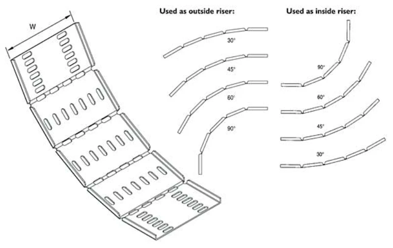 Technical Specifications Technical Specifications Bend/riser for cable tray Material Steel Colour Zinc Bend model Segmented bend Surface protection Hot dip galvanized Change of direction Rising/descending Model Integrated coupler Construction type Adjustable bend Angle Adjustable Suitable for cable tray width 50 mm Suitable for cable tray height 18 mm Material thickness 1 mm Suitable for circuit integrity Yes Side wall perforation No NATO-mounting holes No Mounting perforation in base Yes With cover No · Technical Data Sheet – Click to Download · Technical Data Sheet – Click to Download