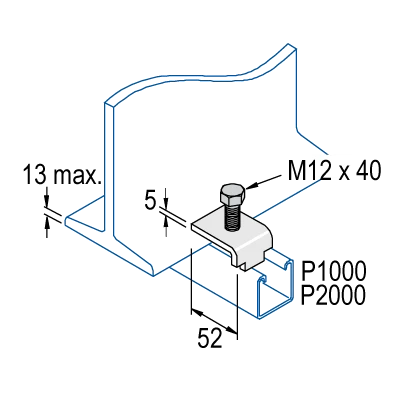 Unistrut P1386 S1 flat beam clamp for use with Unistrut or similar channel systems, mild steel bright zinc plated · · · Channel|Features|Static Load 1900 Newtons (N) · · Material steel · · Hot dip galvanised finish · · Length 52mm · · Width 12mm · · Thickness 5mm