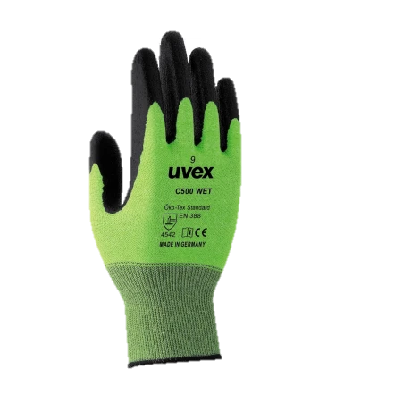 The UVEX C500 foam, wet, wet plus and sleeve models are all certified in accordance with EN 407 for contact heat up to 100°C · · · Patented uvex Bamboo TwinFlex® technology · · Innovative SoftGrip coating · · Very high cut protection & Highest wearing comfort due to uvex climazone · · Outstanding tactile feel, High abrasion-resistance & High flexibility · · Silicone-free according to imprint test · · Certified according to OekoTex Standard 100 · · The uvex C500 foam, wet, wet plus and sleeve models are all certified in accordance with EN 407 for contact heat up to 100?°C