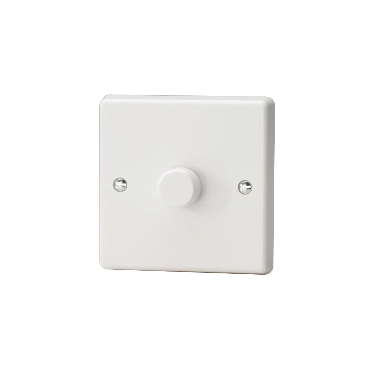 V-Com 1 Gang 2-Way Push-On/Off Rotary LED Dimmer · · · V-Com intelligent dimming technology · · Soft start feature and intelligent overload protection · · Adjustable minimum brightness setting and choice of driving modes · · Leading edge dimming · · Durable white plastic · · Suitable for indoor use only · · Meets BS EN 60669-2-1 standards · · Made of durable white plastic