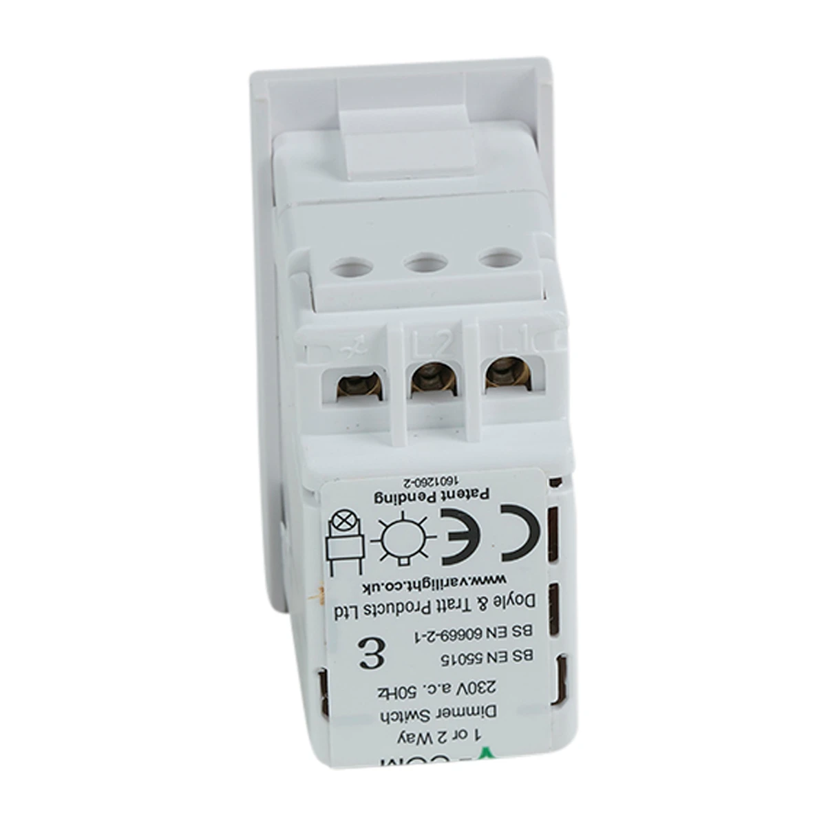 V-Com series comprises of programmable intelligent dimmers which have a push-on/push-off switch action with rotary dimming. All V-Com dimmers offer smooth LED dimming technology to deliver the best possible dimming performance for a given load. V-Com dimmers are designed to control LED lighting loads requiring leading-edge (triac) control with options from 0W-100W (max. 10 LEDs), 15W-180W (max. 20 LEDs), 15W-220W (max. 26 LEDs), 20W-400W (max. 40 LEDs) and 40W-600W (max. 60 LEDs). · · · Soft start feature and intelligent overload protection · · Adjustable minimum brightness setting and choice of driving modes · · Create your own switch/data combinations · · Create your own switch/data combinations · · Indoor use only · · Overload protection · · BS EN 60669-2-1 · · 85365007 common code