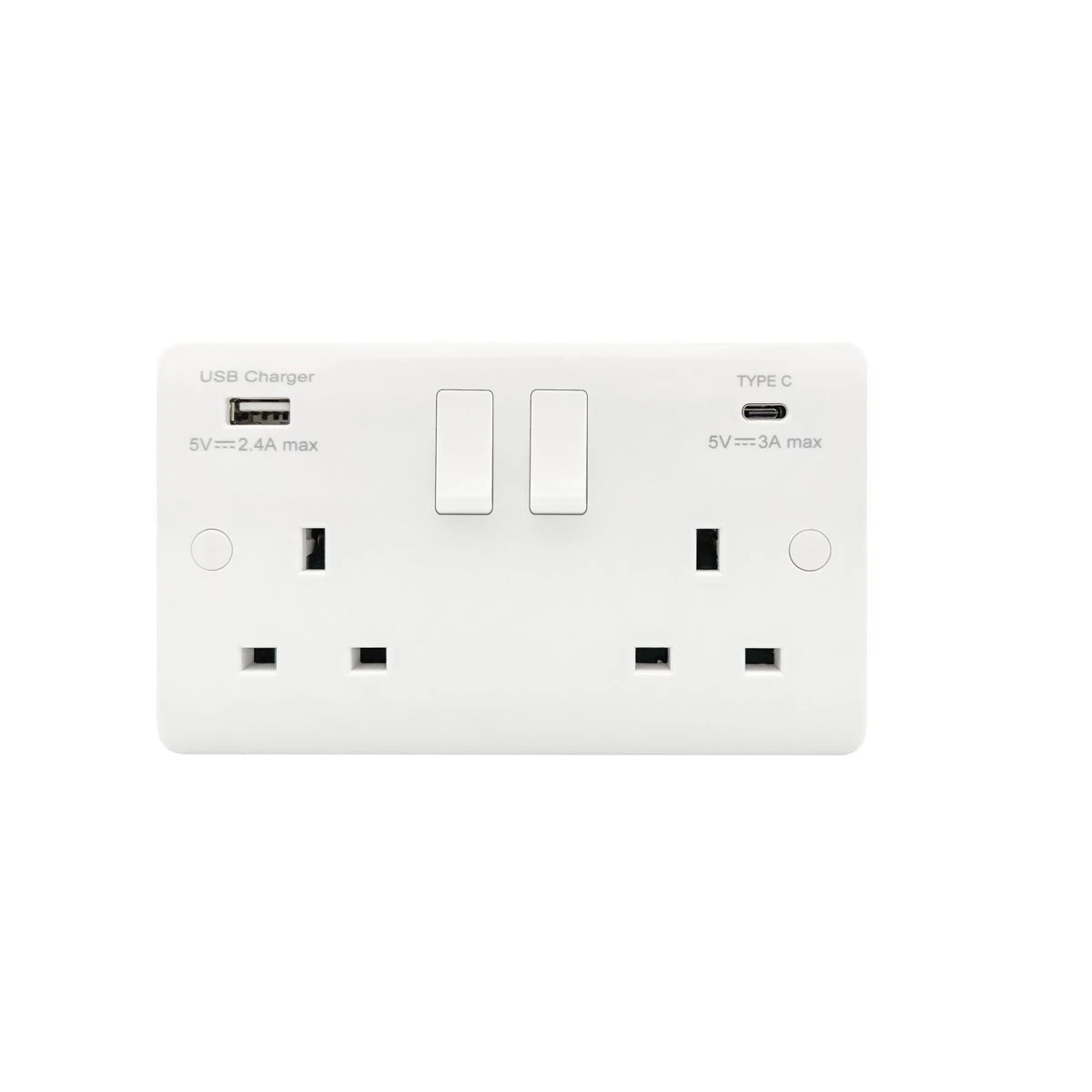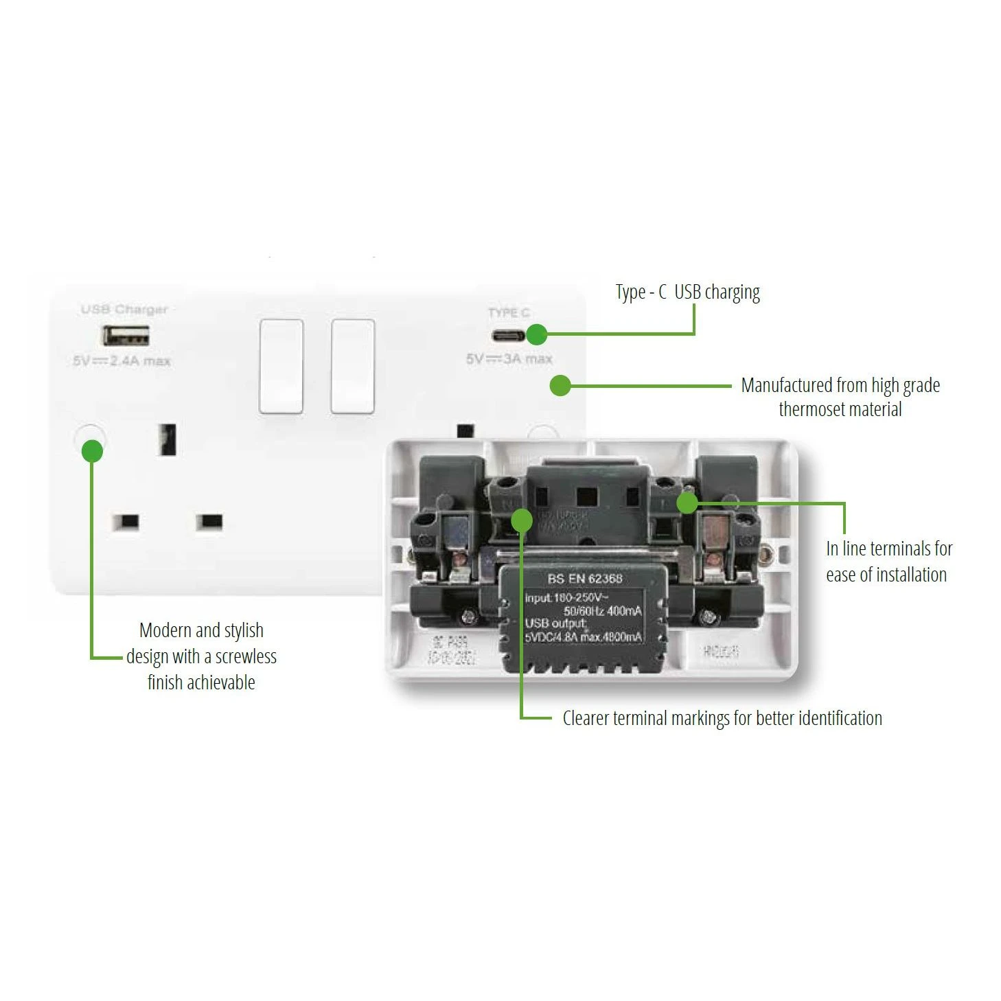 2 Gang 13A Socket complete with 2 X USB outlets – 1 X Type C & 1 X Type A. Up to 3A USB charging. · · · Type C&A USB Charging · · Manufactured from high grade thermoset material · · In line terminals for ease of installation · · Clearer terminal markings for better identification · · Modern and stylish design with a screwless finish achievable · · 2.4A Type A Charging · · 3A Type C Charging