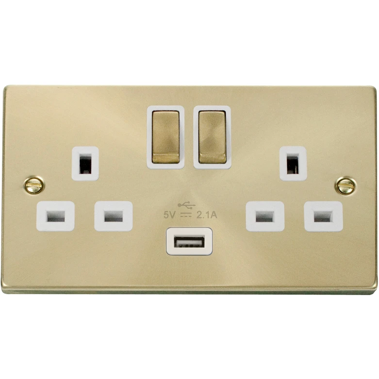 Deco victorian satin brass white insert 13A ingot 2 gang switched socket outlet with single 2.1A USB outlet. · · · Dimensions 146mm (W) x 88mm (H) x 8mm (D) · · Plate Design & Finish Victorian Satin Brass · · Insert & Gasket Colour White · · Front Plate: Stainless Steel · · Insert & Gasket Colour White · · Front Plate: Stainless Steel · · Insert: Urea · · Maximum Voltage 250V 50Hz · · Load Rating 13A · · Plate Fixing Centres 120.6mm