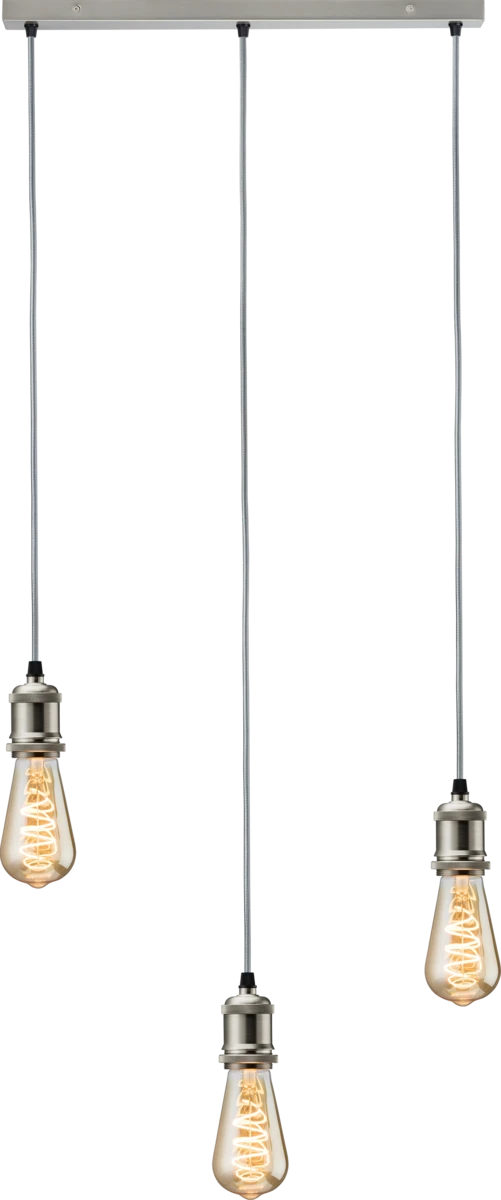 The Calla 230V E27 vintage 3 light bar pendant brushed chrome is a stylish and elegant pendant light that is perfect for adding a touch of vintage charm to any room. The pendant features a brushed chrome finish and three adjustable light heads, allowing you to direct the light where you need it most. · · · 3 light bar ceiling pendant with vintage style lamp holders, in a brushed chrome finish. · · Each drop has 1.8m grey fabric flex cable, where height can be adjusted independently. · · Fitting is stylish on its own or accompanied with filament lamps and cages/ shades, to create different look and style within a roomset. · · Each lamp has 1.8m cable · · Adjustable cable length · · 3 x E27 lamps (40W max., not included)