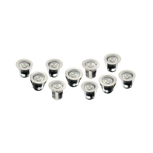 VITA 3.6W LED circular kit with 10 fittings, IP68, Warm Whit · · · Suitable for use in indoor and outdoor applications: bars, stair risers & strings, ceilings, restaurants, kitchen unit plinths, decking areas, patios, paths & walkways · · LED replacement for halogen decking lights · · Plug & Play kit containing 10 miniature fittings, each with 3 LEDs, 6W IP44 driver, cables and junction box · · Stainless steel cowl and spring clips · · Each fitting prewired with 5m cable · · Wide operating ambient temperature range of -20C to +40C”
