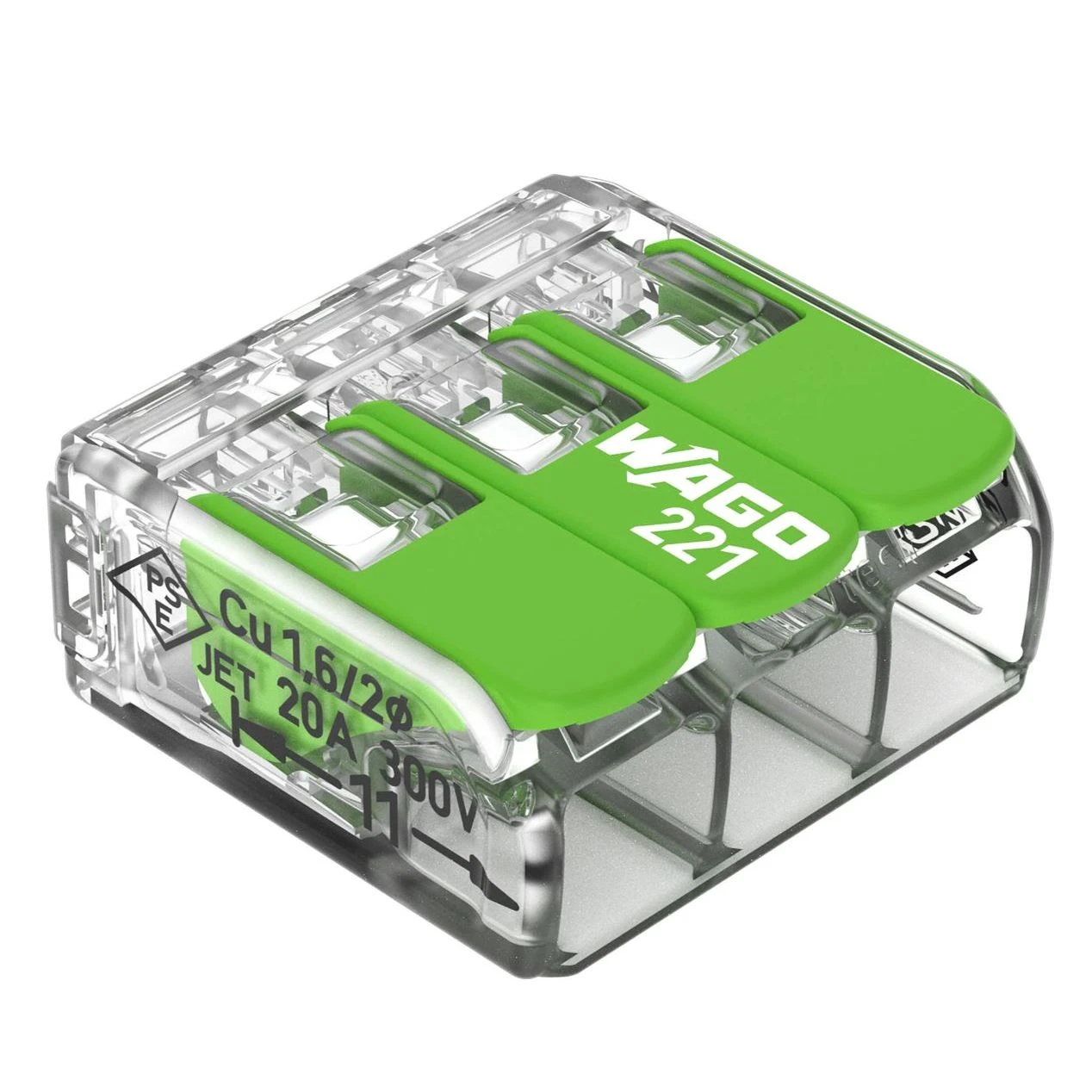 The Wago 32a 450v 4kv 4mm splicing 3 way compact complete with levers clear connector is a compact and easy-to-use splicing connector for connecting up to three solid, stranded, or flexible copper wires. It is ideal for use in a variety of applications, including electrical installations, lighting systems, and industrial control systems.The connector features a transparent housing that allows for visual inspection of the wire connections, and orange levers that make it easy to open and close the connector. It also has three test ports for easy testing of the connections.The Wago 32a 450v 4kv 4mm splicing 3 way compact complete with levers clear connector is a safe and reliable way to connect wires. It is approved by ENEC and UL, and is backed by Wago’s renowned quality and reliability. · · · Plastics made partially from post-consumer recycled material (such as recycled PET bottles) and bio-based recyclables from industrial and household use · · Reduced consumption of fossil resources · · Ease of use – pull the lever up, insert a conductor and push the lever back down · · Available as 2-, 3- and 5-wire connectors · · Easily terminate conductors from 0.14 to 4 mm · · Connect solid, stranded and fine-stranded conductors · · Time savings for installers and device manufacturers · · Quickly install devices with higher power consumption