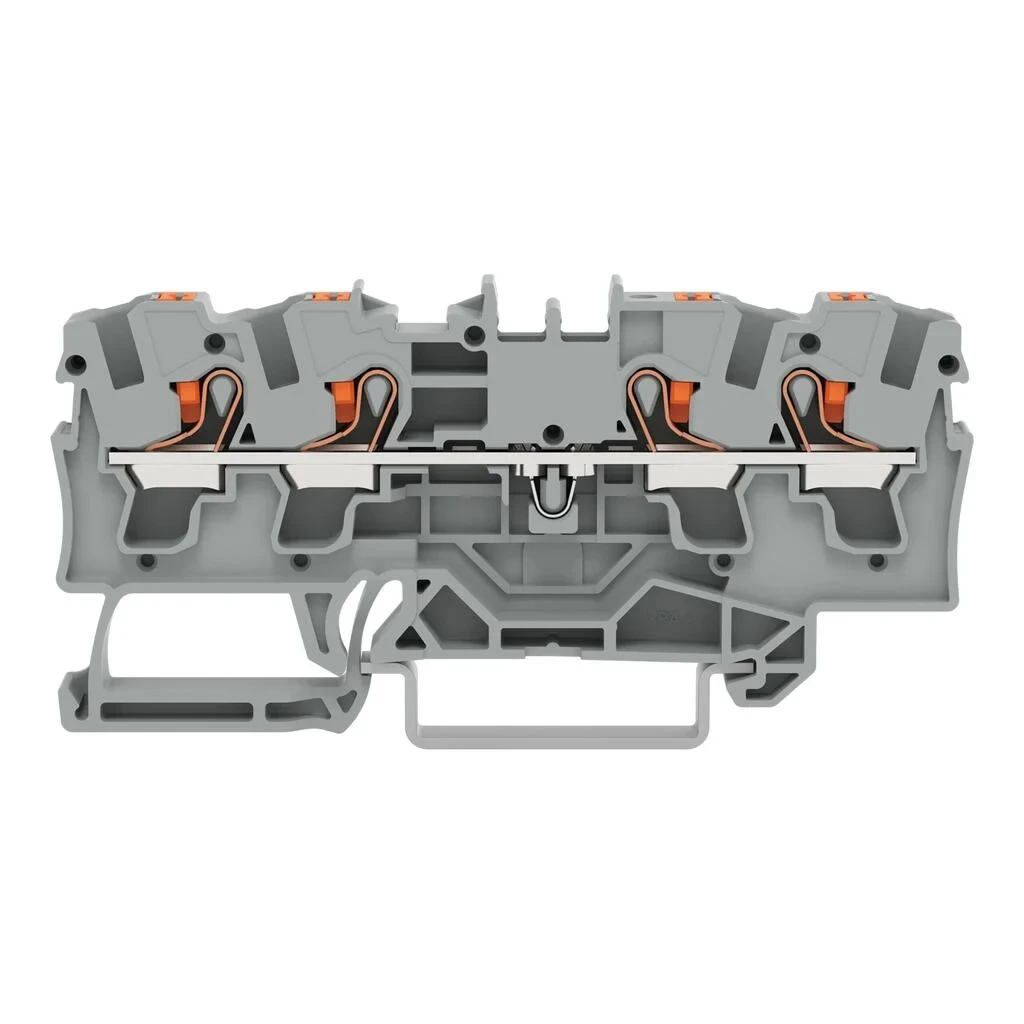 Wago 4-Conductor Through Terminal Block With Push-Button 4mm² With Test Port Side And Center Marking For Din-Rail 35 X 15 And 35 X 7.5 Push-In Cage Clamp 4mm² Grey