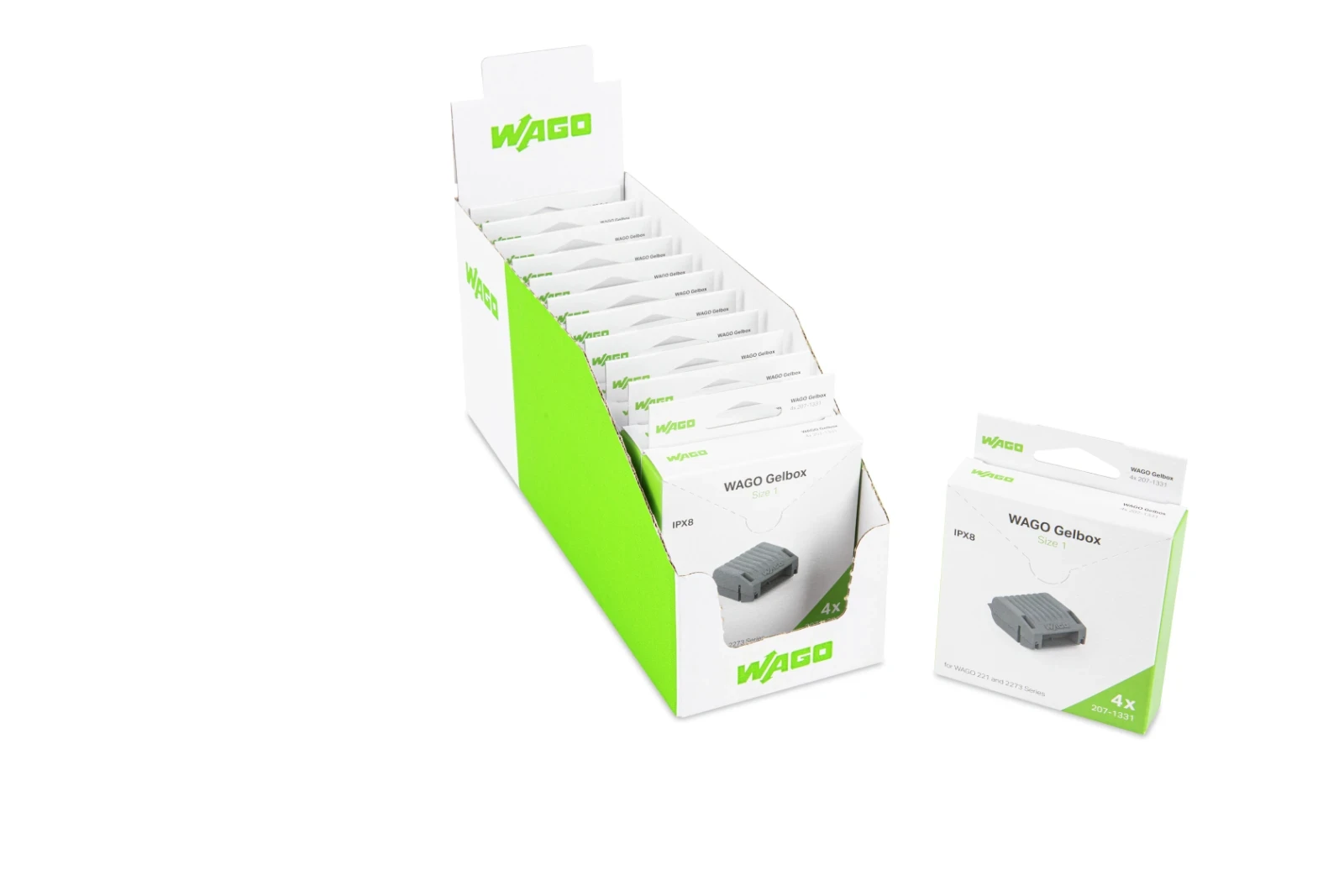 This is a size 1 gel box from WAGO is quick and easy to install without tools and is used to protect 221 and 2273 series connection terminal blocks from moisture. · · · Easy, fast and safe to use · · Can be used immediately and accessed again later · · Silicon-free · · Label-free · · The complete system consisting of WAGO’s gelboxes and splicing connectors has been VDE-tested and IPX8-certified.