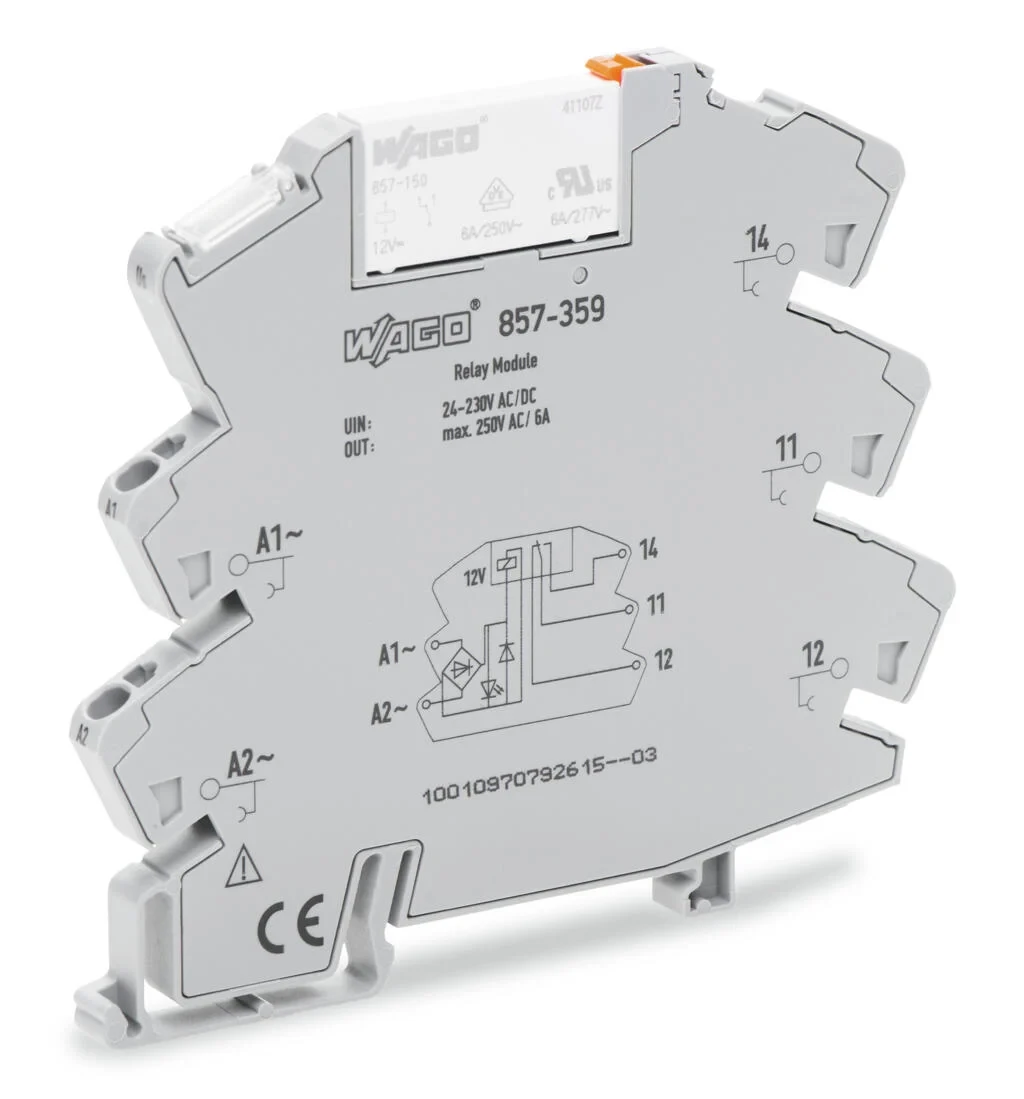 The 857-359 WAGO is a single-channel, changeover relay module with a 24V AC/DC coil voltage and a 6A switching current. It has a wide contact rating of 250VAC/6A, making it ideal for controlling a variety of loads. The 857-359 WAGO is also equipped with a yellow LED indicator that shows the status of the relay. It is a compact and easy-to-use device that can be mounted on a DIN rail. · · · Single-channel, changeover relay module · · 6A switching current · · Compact and easy-to-use · · DIN rail mountable · · Lightweight and self-extinguishing · · Base holes to NF EN 50085 · · Break points on fingers and base · · Supplied in 2m lengths · · UL Recognised: UL 1565 | E509564 · · Flame Resistance: V0 UL94