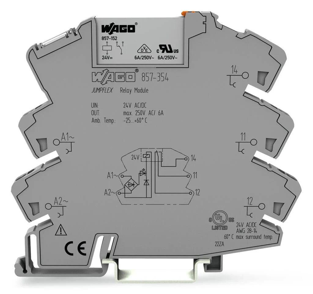 The 857-354 WAGO is a 24V AC/DC relay module with one changeover contact (CO). It has a rated coil voltage of 24V AC/DC and a rated switching current of 6A. The 857-354 WAGO is a compact and easy-to-use device that can be mounted on a DIN rail. It has a built-in LED indicator that shows the status of the relay. The 857-354 WAGO is a reliable and versatile device that is ideal for a variety of applications. · · · 24V AC/DC relay module · · One changeover contact (CO) · · Rated coil voltage: 24V AC/DC · · DIN rail mountable · · Lightweight and self-extinguishing · · Base holes to NF EN 50085 · · Break points on fingers and base · · Supplied in 2m lengths · · UL Recognised: UL 1565 | E509564 · · Flame Resistance: V0 UL94