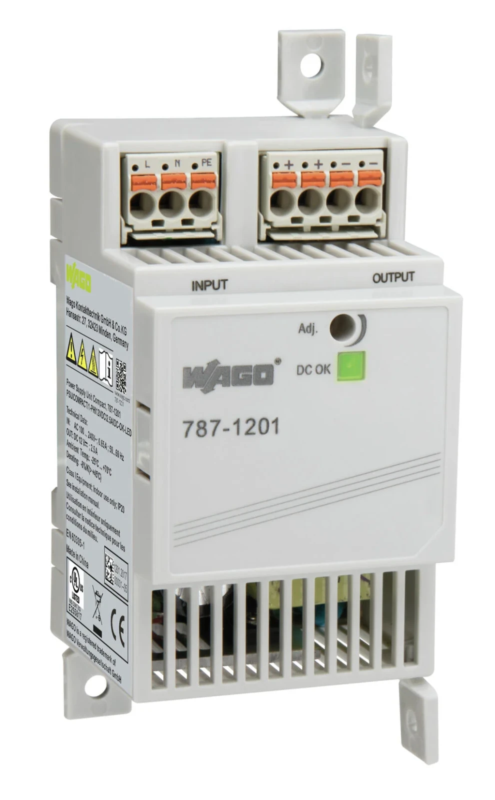 The 787-1201 WAGO is a single-phase switched-mode power supply (SMPS) that provides a regulated 12 VDC output voltage at a maximum current of 2.5 A. It is designed for use in a variety of applications, including industrial automation, control systems, and test equipment. The 787-1201 WAGO is a compact and lightweight unit that is easy to install and use. It features a built-in input filter and output fuse, as well as a variety of safety features, including overvoltage protection, undervoltage protection, and overload protection. The 787-1201 WAGO is also available in a variety of other output voltages and currents, making it a versatile power supply solution for a wide range of applications. · · · Stepped profile for installation in standard distribution boards · · Removable front panel and screw mounts for alternative installation in distribution boxes or devices · · Pluggable picoMAX Connection Technology (tool-free) · · Suitable for both parallel and series operation