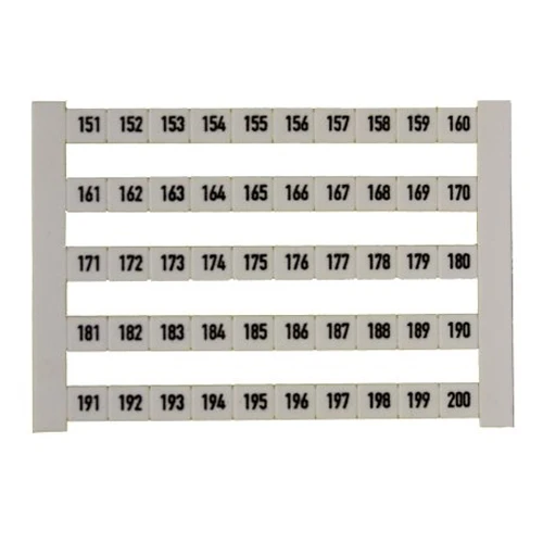 Weidmuller 0468660151 Dekafix white terminal marker suitable for all Weidmuller cable connectors. The DEK 6 FW 151-200 marker made of polyamide 66. It features legend 151 through 200 marking, horizontal orientation and MC laser printing method. Material colour according to resistance code is 9. Dekafix (DEK) marker is the universal marker for all conductor and plug-in connectors as well as for electronic sub-assemblies. The system is ideal for short number sequences and covers a large range of ready-printed markers. Strips for fast installation in one work step. The printing is easy to read and rich in contrast. · · · Colour: White · · Length: 5mm · · Material: Polyamide 66 · · Width: 6mm · · Weight: 50g