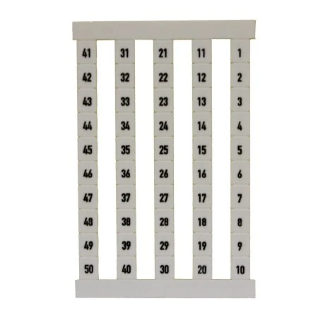 Weidmuller 0468260001 Dekafix white terminal marker suitable for all Weidmuller cable connectors. The DEK 6.5 FS 1-50 marker made of polyamide 66. It features legend 1 through 50 marking, vertical orientation and MC laser printing method. Material colour according to resistance code is 9. Dekafix (DEK) marker is the universal marker for all conductor and plug-in connectors as well as for electronic sub-assemblies. The system is ideal for short number sequences and covers a large range of ready-printed markers. Strips for fast installation in one work step. The printing is easy to read and rich in contrast. · · · Colour: White · · Length: 5mm · · Width: 6.5mm · · Weight: 64g · · Material: Polyamide 66
